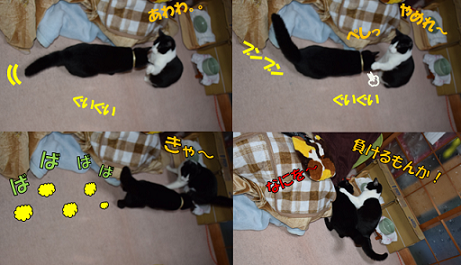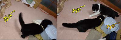 いつもは、くろちゃんがゴロンと仰向けになってチョイチョイ手を出して誘い、うっちゃんがソレに乗っかって遊びのスタート。