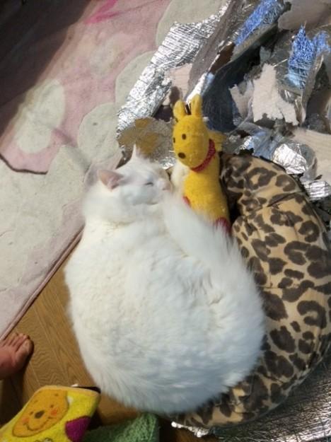 このキリン、マリーに首をかじられて、中の綿が出てきてるんですよね><。