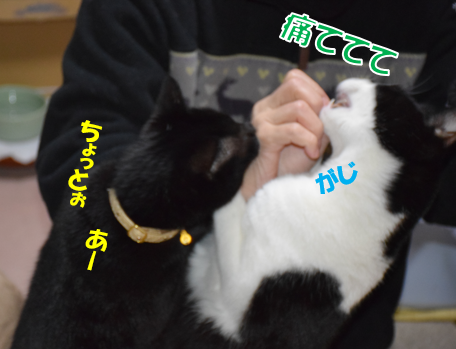 我慢出来なくなったうっちゃんがお父さんの腕を両手で抱え込み、おやつを持った手にがぶり。