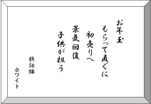 堅実な子供は貯金するっていうらしいけど、主の所は大学生のお姉ちゃんはお年玉でデジカメを、中学生のお姉ちゃんはゲームソフトを買いに行ったよ。でもさ、良く考えてみれば全部親や身内が出しているんだよね。この季節子供の方が金回り良いよ。あー景気回復は子供の手に委ねられているのかな。