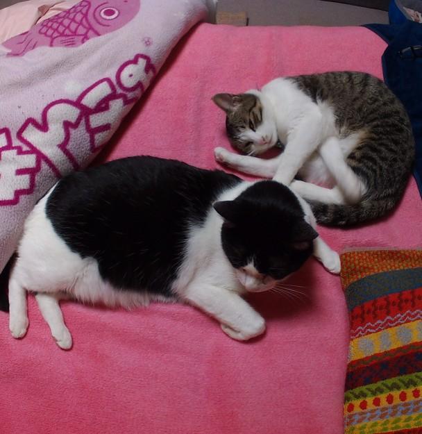お母ちゃんのベッドで、ごろごろしている、ハチ君と七七保。