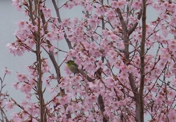 メジロちゃん、つがい?夫婦??で一所懸命花の根元の蜜を食べてました♪