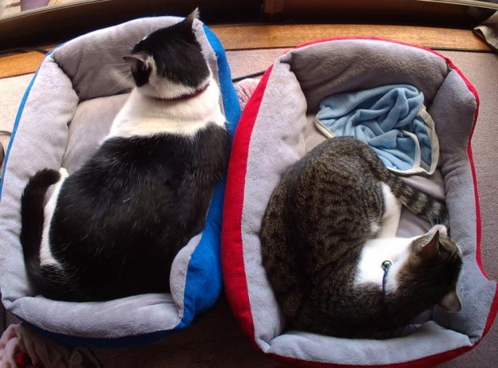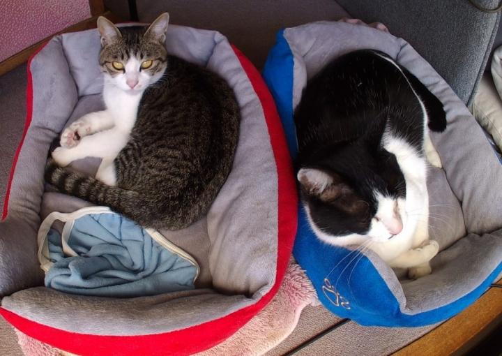 サッシ戸のところの、ペットベッドに入ってくつろぐ、ハチ君と七七保。