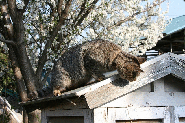 スモモの木の傍の古い百葉箱にニャアをのせてみた。