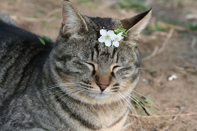 可愛らしい花をニャアの頭にのせてみる。可愛いじゃないの~♪