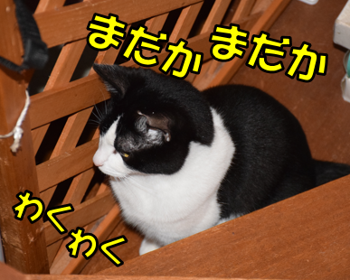 猫さんたちは、お父さんがパンを持ってくることを学習していて、1階のラティスの前で待機です。