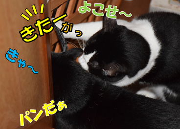 お父さんにまとわりつきながら、お父さんと一緒に2階に上がり、おやつを貰うのでした。