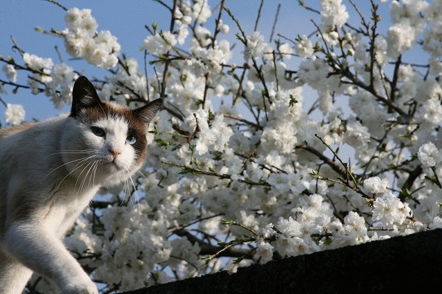 満開になったら、塀に猫をのせて写真撮影をしようと思っていたところ。