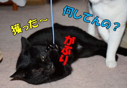 フリフリ遊んでガップリ噛みつくと、まるでネズミを仕留めたかのように両手でしっかり捕まえます。