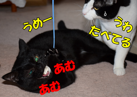 このじゃらしを見せると、ゴハンを持って来た時と同じ鳴き声でねだります。