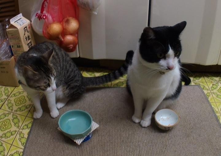 「ハチお兄ちゃん~、あたちも待ってんねんけど、まだご飯、出ちてもろてへんねん…。ホラ、空っぽのままやん。」