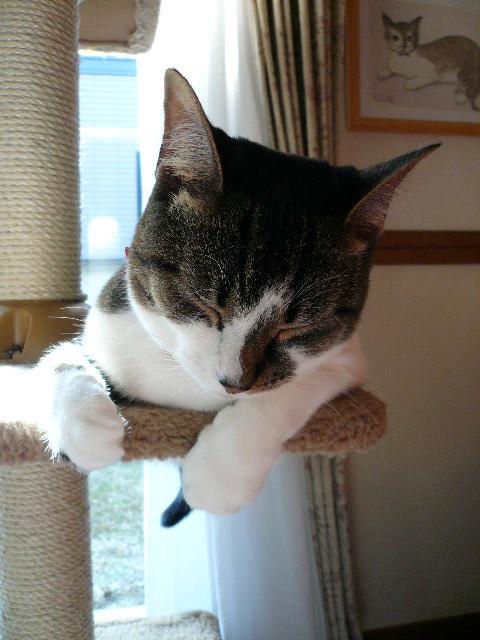はなちゃんったら 今日キャットタワーに乗ったまま 私のことをじーっと見ていて いつのまにか うとうと・・・いねむりしちゃってるの♪