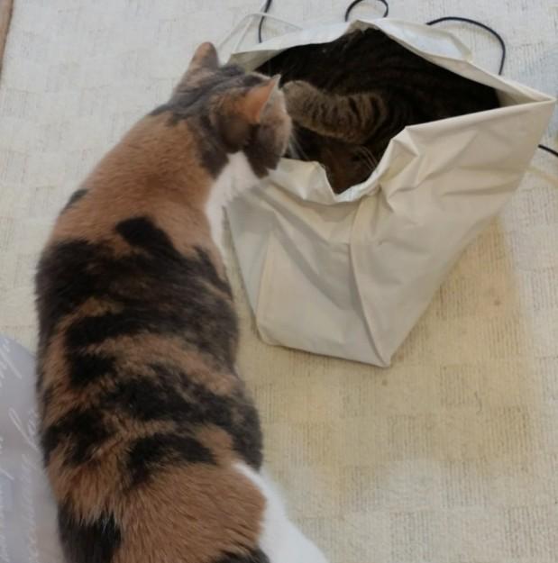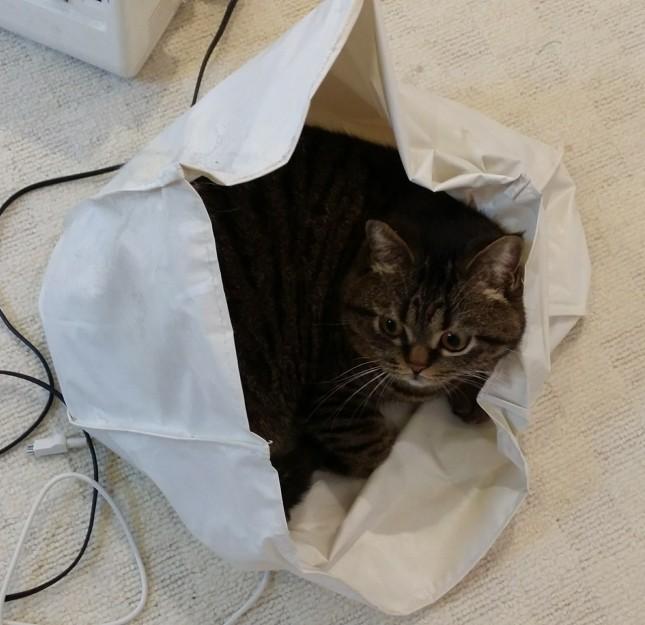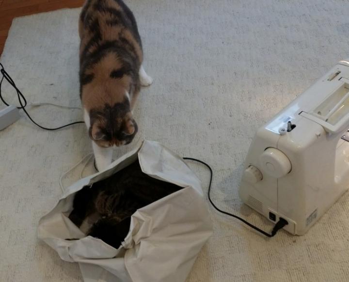 ルナ子、ミシンのカバーに上手にもぐりこみました♪