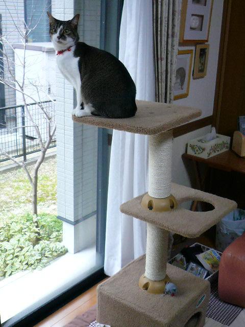 キャットタワーをお誕生日(12月1日)に買ってあげてから 2段目にしか乗らなかったはなちゃん・・・。