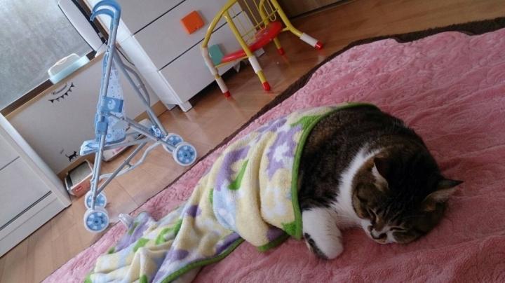 孫が毛布を掛けて上げたそうです。大きな枕みたいです(⌒∇⌒)