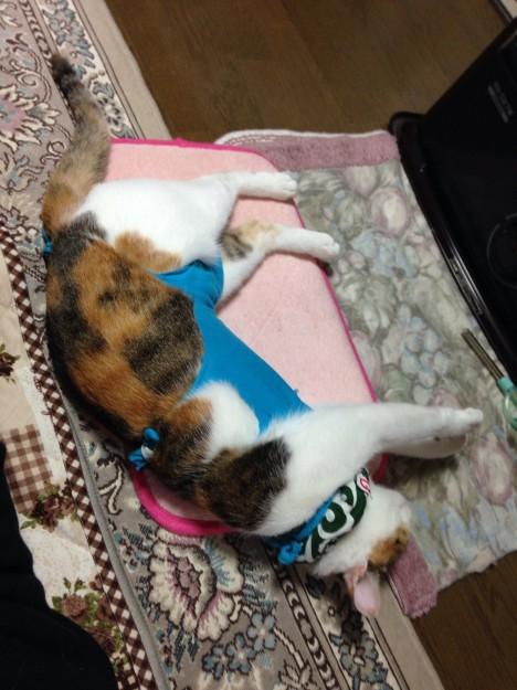 腸閉塞ではなかったものの、舐めハゲが悪化するためエリカラ購入。しかしソフトカラーのためお腹に届いてしまってハゲ治らず、術後服を試作する毎日…