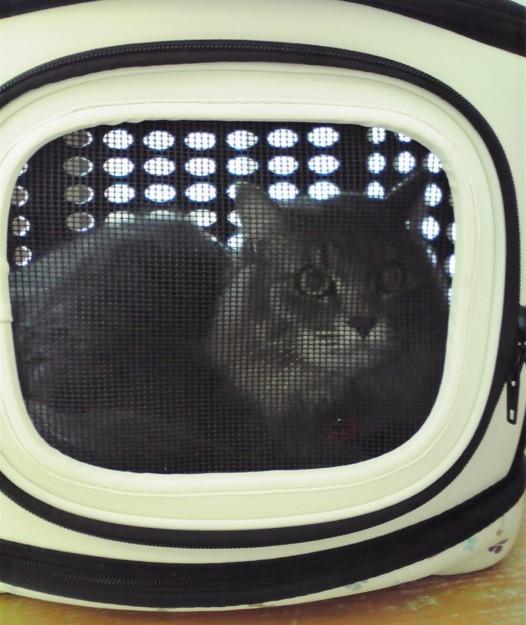 今日はカラーを付けられ、後ろ足からの採血でした。