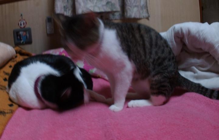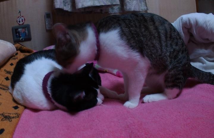 「ニャアて、ハチお兄ちゃん、起きようニャ~。起きて、あちょぼ~。ペロペロペロペロ。」