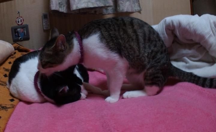 「ハチお兄ちゃん、もう起きたら?寝ちゅぎやわ。ニャア?ペロペロ。」