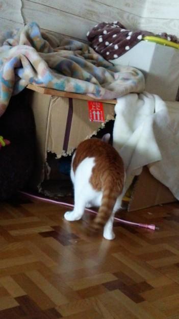 段ボールハウス冬の間はモーフをかけて