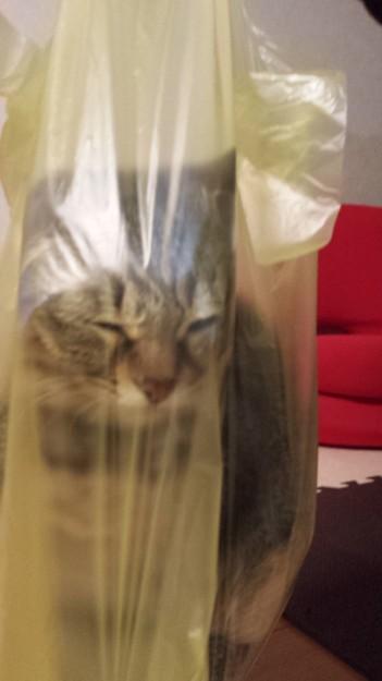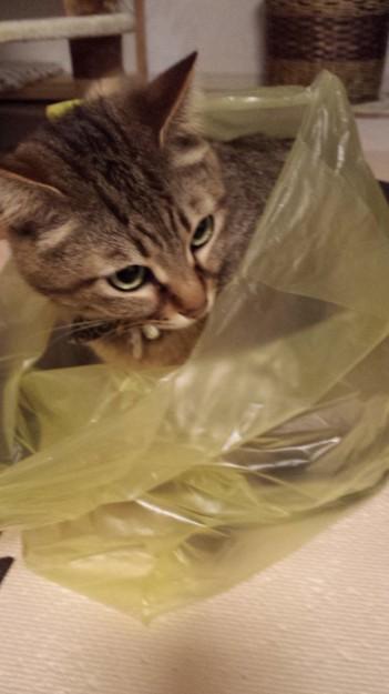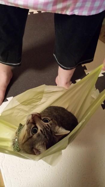 スーパーの袋にドラッチョが入ってしまい、なかなか退かなかったので持ち上げてみたら、暴れもせずに持ち上げられてた。