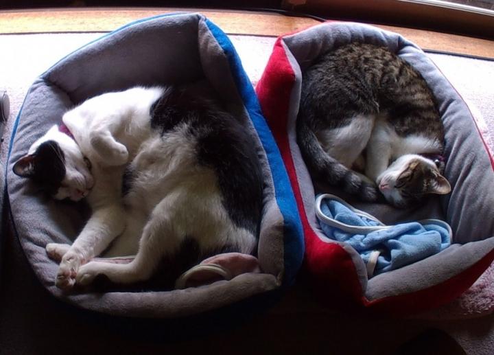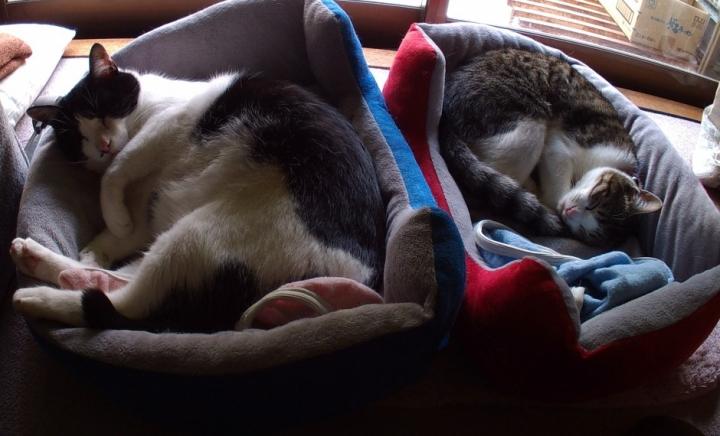 それぞれ入って、すやすや眠る、ハチ君と七七保です。