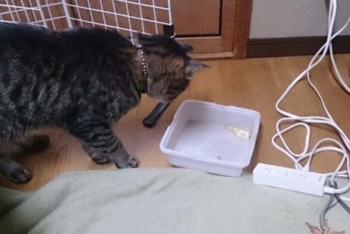 和式みたいに容器をまたいでオシッコしたのか、後ろ足を揃えて中に入れてしたのか