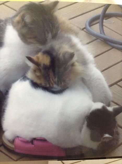 お父さん猫の、ねこやんの上に、お母さん猫のくっちーと、一人娘のボメロス。