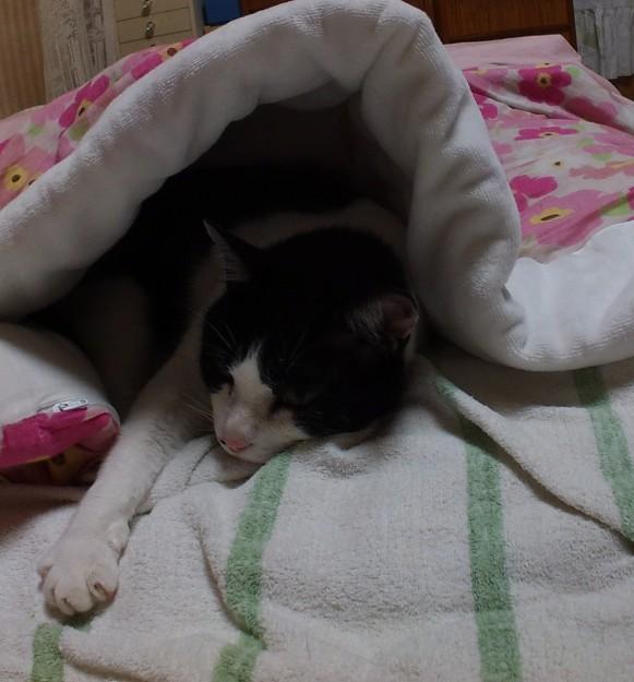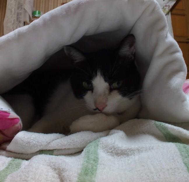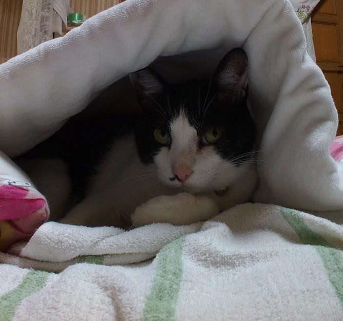 掛け布団を、かまくらみたいにしてもらって、ご満悦です。