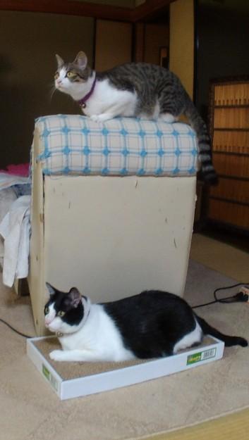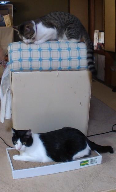 ハチ君は爪とぎに乗って、七七保は、椅子の上で休憩。