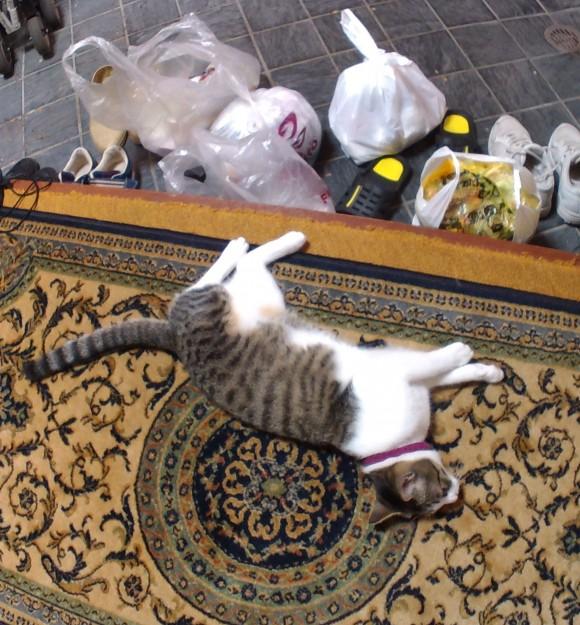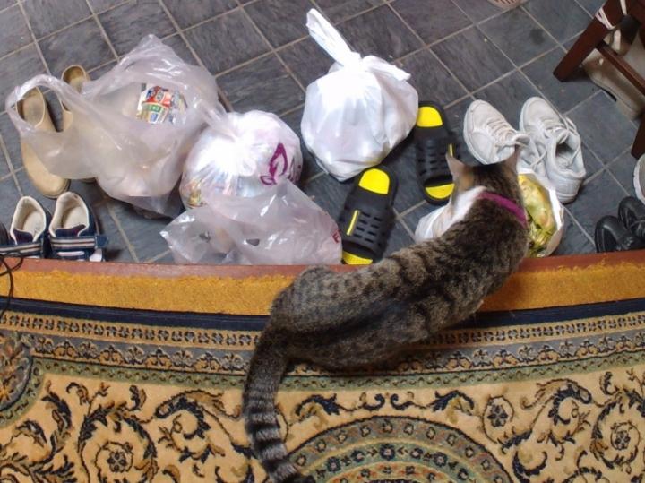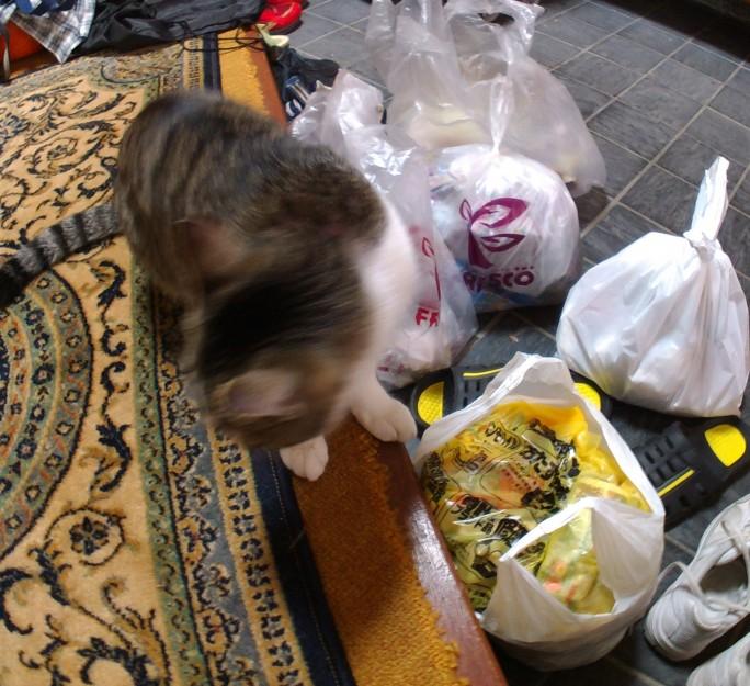 「ふくろ、いっぱいやニャ。何が入ってんニョかニャ?くんかくんか。」