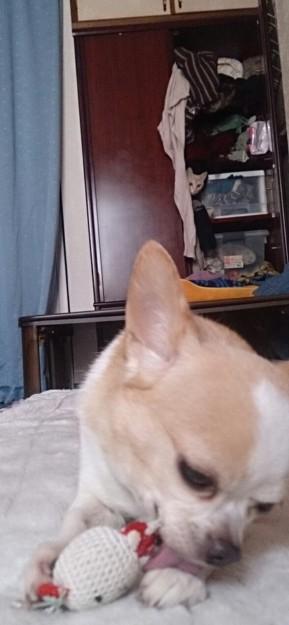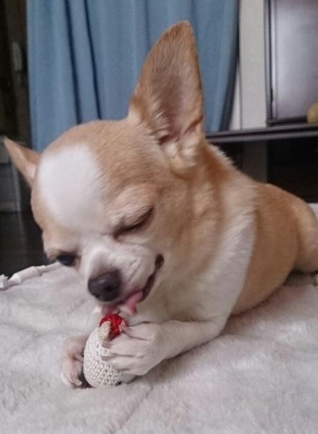 プゥちゃんご機嫌に編みぐるみのうさぎちゃんをカミカミ♪♪