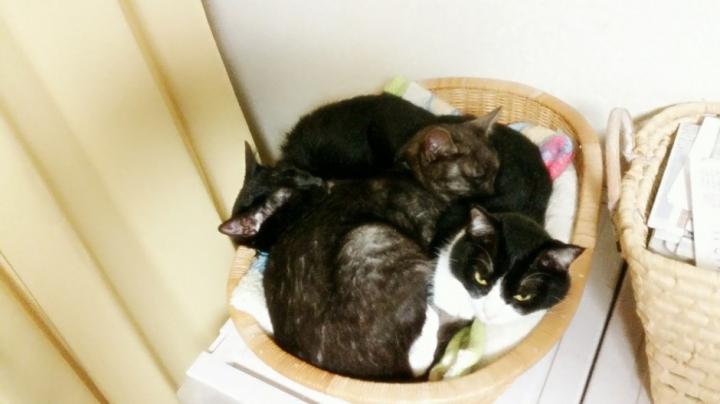 ひとつのかごの中にひしめき合って寄り添う三匹。
