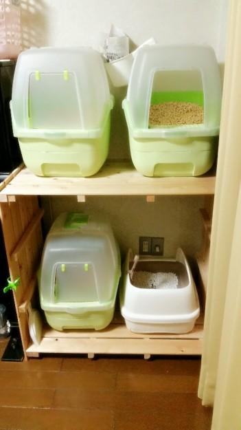 うちには、5匹も猫がいるので、トイレも5個あります。
