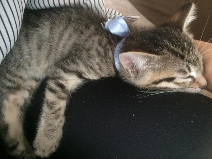 朝探すのにドタバタするので、お手製鈴をつけました♥