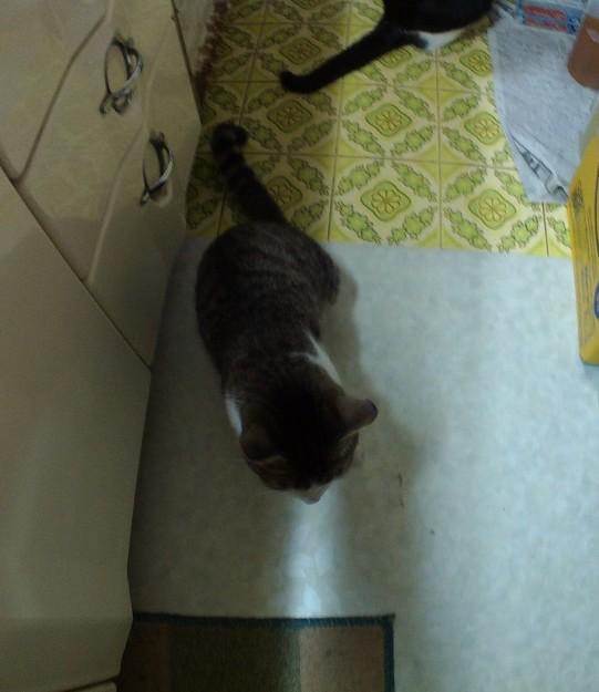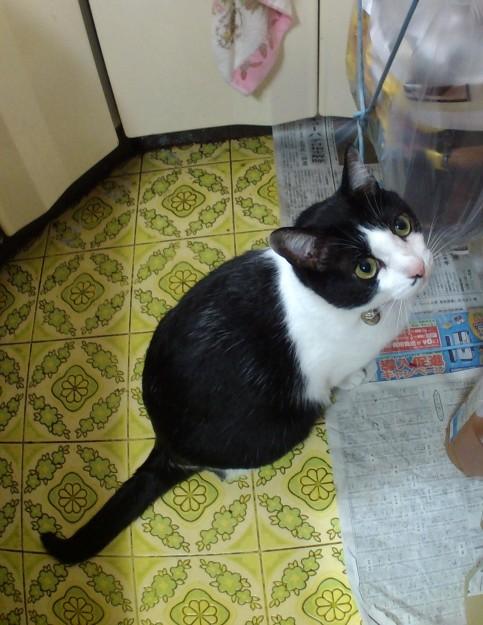 夕食前、台所で遊ぶ、お暇なハチ君と七七保。