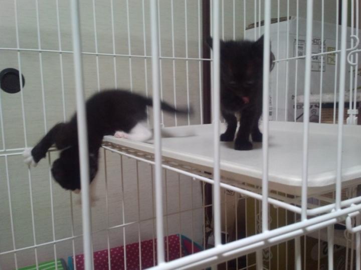 5月20日、仕事から帰宅すると、それまでは登ることのなかったケージの2段目に2匹揃って登って並んで、帰って来た私をじっと見ていた。(よじ登れるようになった。)