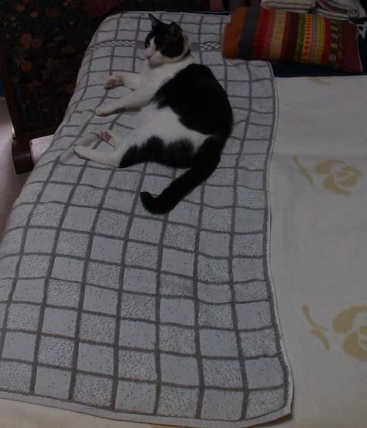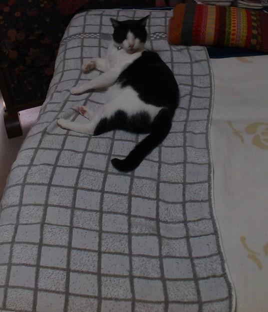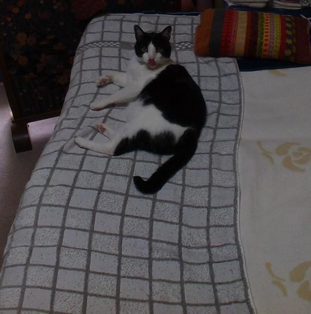 お母ちゃんのベッドの右端で、ひとり寝そべるハチ君。