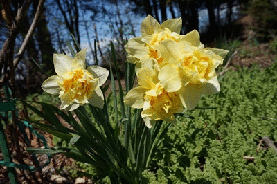 レモン色八重の水仙紫のプリムラ白の芝桜。