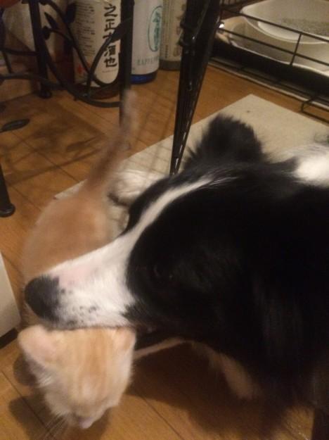 きなこを育ててくれたボーダーコリーのレディが、再会して嬉しいのか…きなこを舐めて舐めて、連れ回して