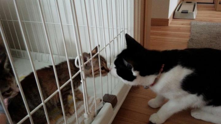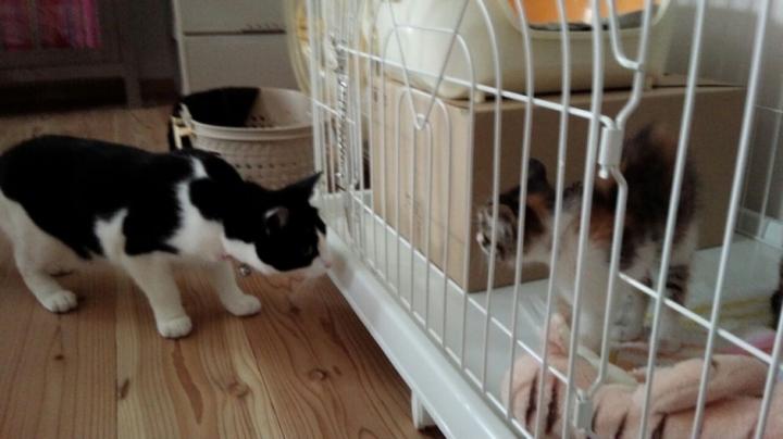 最初は別の部屋にいたのですがハジメが扉を開けるように要求したので、まずはケージ越しのご対面!