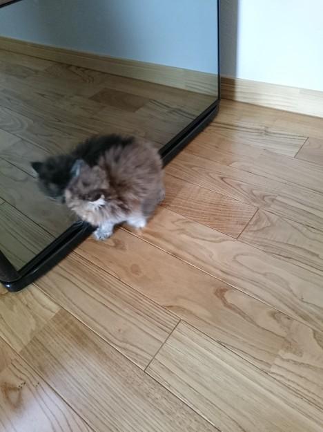 よく見たら、冷蔵庫に写った自分を威嚇してる。(笑)