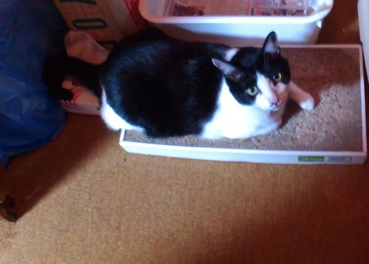 爪とぎの上に、座り込むハチ君。