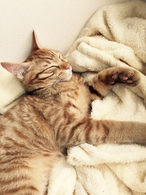 こーんなに小さくて。私を初めて見た時、茶トラのウルは興奮してカーテンに登り、キジ猫のキリはびっくりして後ろにステーンと尻餅をつきました。(その後ウルは登りきれずキリの頭の上に落ちました 笑)