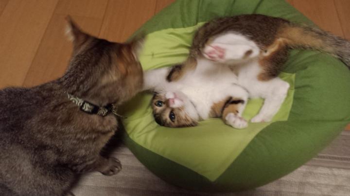 ドラニコちゃんが寝てる所にペロペロしながら噛みついて、寝場所を乗っとります。