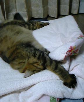 最初の頃はゴロゴロいいながらモミモミしてたんだけど・・・・最近はタオルを噛んで引っぱっていろんな方向を手、足で揉んでる。それも恍惚の表情で!!イヤン