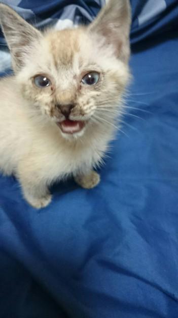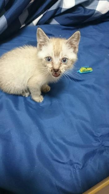 月齢は1ヶ月程、猫風邪をひいており、薬に点眼、もちろん我が家のニャンズとは完全隔離です。