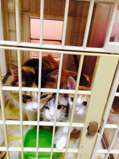 さて、ケージから出したら縦横無尽に走り回ってスリーショットが撮れないので、仕方なくの柵越し。