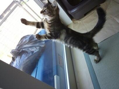 ・手作りの猫じゃらしを咥えて持ってきては、遊んでーと要求。
