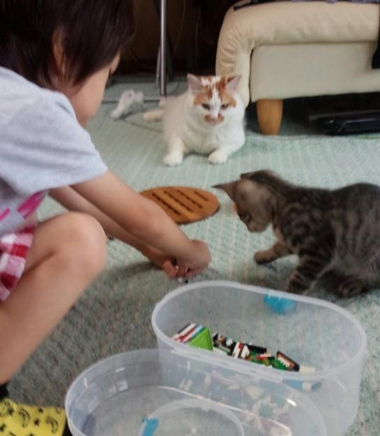 息子とブロックで遊ぶ子猫を遠くから眺めるふうすけ…